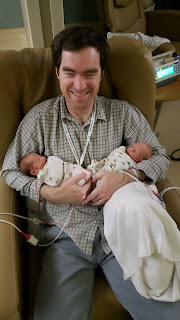 The babies were on a schedule of 'cares' every 3 hours. This meant diaper change and feeding at a minimum, and also sometimes blood pressure and temperature checks. DH was amazing and started participating in cares as soon as possible. I joined in once I started to be in a bit less pain, around 2 weeks. We also had rounds once a day. DH and I made it an point to attend rounds every day, and we typically attended all cares except the 4am set, although we'd trade off who was present.